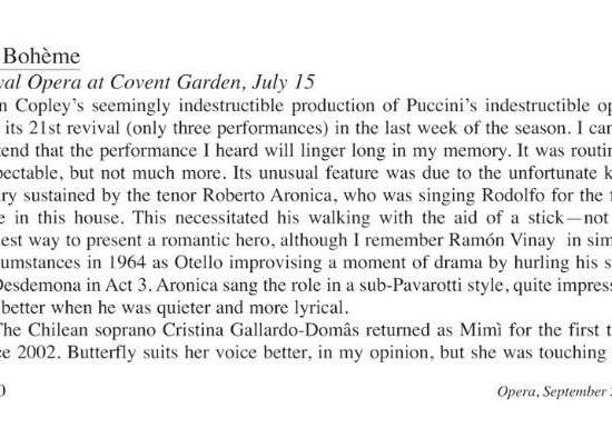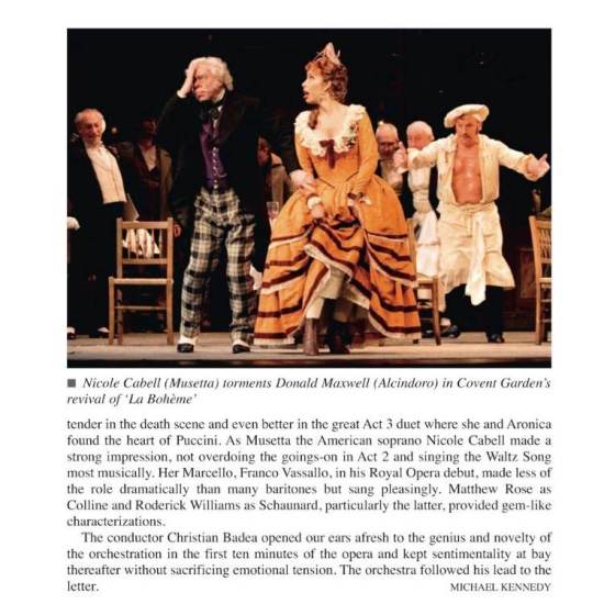 În continuare, prima cronică, din numărul pe luna septembrie 2008 al revistei Opera Magazine, despre această „La Bohème” – transcriu, tradus, pasajul despre Christian Badea: