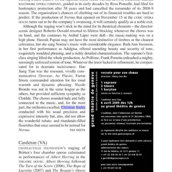 Pe urmă, în numărul din luna martie 2009, am găsit o cronică de la un spectacol cu „Norma” de Bellini, de la opera din Baltimore și dirijorul este apreciat astfel: