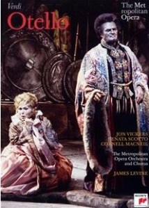 Dacă discul din 1947 al lui Toscanini este considerat de multă lume drept cel mai bun, dacă versiunea live din 1938 a lui Martinelli mă uimește pe mine până la a-l considera Otello suprem, criticii francezi de la Diapason mizau pe acest disc al lui Vickers ca fiind cel mai reușit. Tenorul canadian este într-adevăr cel mai liric, o ruptură față de tradiția eroului militar cu exces de testosteron, care făcuse legea în ultimii 20 de ani. Rysanek este ideală, cu o voce pură, a unei Desdemone clasice, victima inocentă absolută, Gilda nu e departe, din punct de vedere dramatic de această perspectivă. În 1974, Herbert von Karajan îl convoacă în studio din nou pe Vickers, pentru a înregistra coloana sonoră a filmului pe care îl turna, un film TV care va face epocă în anii ’70 – ’80. De data aceasta, Mirella Freni este o Desdemona remarcabilă, tot în registrul angelic, în schimb Peter Glossop impune obstinat un Jago lipsit de orice subtilitate, aparența fizică a tinereții din film nu poate îndepărta senzația de gratuitate a răului care emană din el. Un al doilea DVD, editat foarte recent, după un telecast de la Met din 1978, ne poate arăta cu adevărat ce însemna Vickers pe scenă, de data aceasta într-o producție semnată de Franco Zeffirelli, unde Renata Scotto și James Levine sunt cel puțin la nivelul lui Freni și Karajan, cu o singură dezamăgire, Jago cel brutal și inexact vocal al unui Cornell MacNeil departe de zilele lui de glorie. Și cu condiția să putem trece cu vederea ridicolul coafurii afro a lui Vickers… 🙂