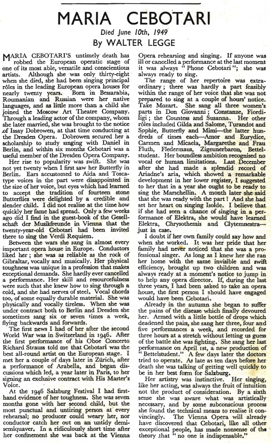 Walter Legge a fost producătorul executiv al fostei EMI, o legendă a lumii muzicii, a făcut istorie înregistrând cele mai celebre discuri realizate vreodată, cele cu Maria Callas, Dinu Lipatti, Furtwängler etc. În numărul din iulie 1949 al revistei Gramophone, Legge a scris un articol în care o comemora pe Maria Cebotari, recent dispărută. Peste numai un an va scrie în aceleași împrejurări tragice și despre dispariția lui Dinu Lipatti.