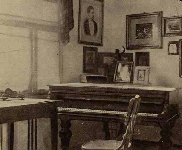 Camera unde lucrează George Enescu, când vine la Dorohoi. Se vede pianul Pleyel, masa, scaunul, călimara și tocul, cu care-și scrie compozițiile. Pe piano, se află un album cu fotografii de familie, rămas dela părinți, în perete, fotografii înrămate, cu dedicația reginei Elisabeta.