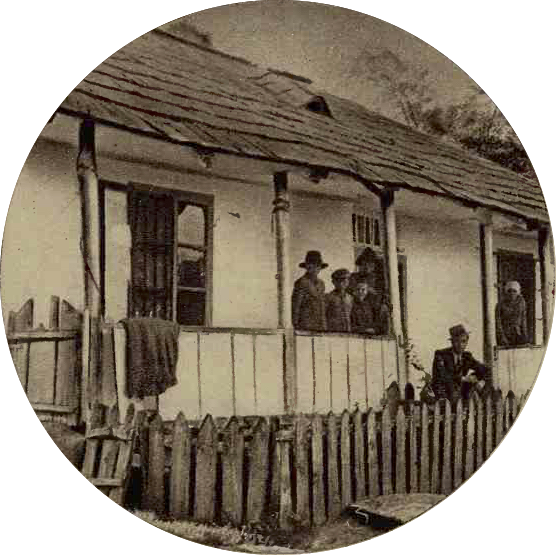Fațada casei, în cerdac, copiii primarului Berbinschi, actualul locatar, precum și alte persoane.