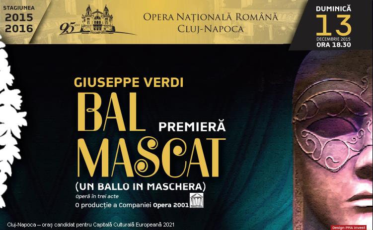Decorurile acestui Bal mascat au fost importate de la compania spaniolă Opera 2001, fiind folosite în stagiunea 2014-15. Costumele și regia de scenă sunt eforturi locale. Producția în sine este clasică, dar cu elemente simbolice: un mare cap așezat în vârful unor scări omniprezente, reprezentând un craniu pentru mare scenă a Ulricăi și o mască pentru balul din ultimul act. Scenografia este completată de niște coloane, inevitabilele spânzurători (dispuse ca pe o Golgotă), tronul din primul act, biroul lui Renato, dar și de un fundal cu proiecții video ale cerului sau ale unor stofe, având marele merit de a nu fi intrusive. Costumele originale (pe care le puteți vedea în galeria foto de la finalul acestui articol) nu debordau de imaginație, dar replicile lor, create la Cluj, erau și mai neinspirate. Inexplicabilă a fost însă absența unei minime regii de scenă, totul reducându-se la o înșiruire interminabilă de posturi scenice din seria celor care alimentează toată panoplia de caricaturi ale stereotipurilor operei (mâna la frunte – pentru durere, mâna sus – pentru înflăcărare, mâna la inimă etc.). Rezultatul: un concert în costume. De ce inexplicabil? Pentru că la Cluj există o facultate de teatru și film (în cadrul Univeristății Babeș-Bolyai) și o secție de regie de operă în cadrul Conservatorului, ceea ce ar trebui să ne facă să cerem de la un spectacol mai mult decât indicarea intrărilor și a ieșirilor din scenă.