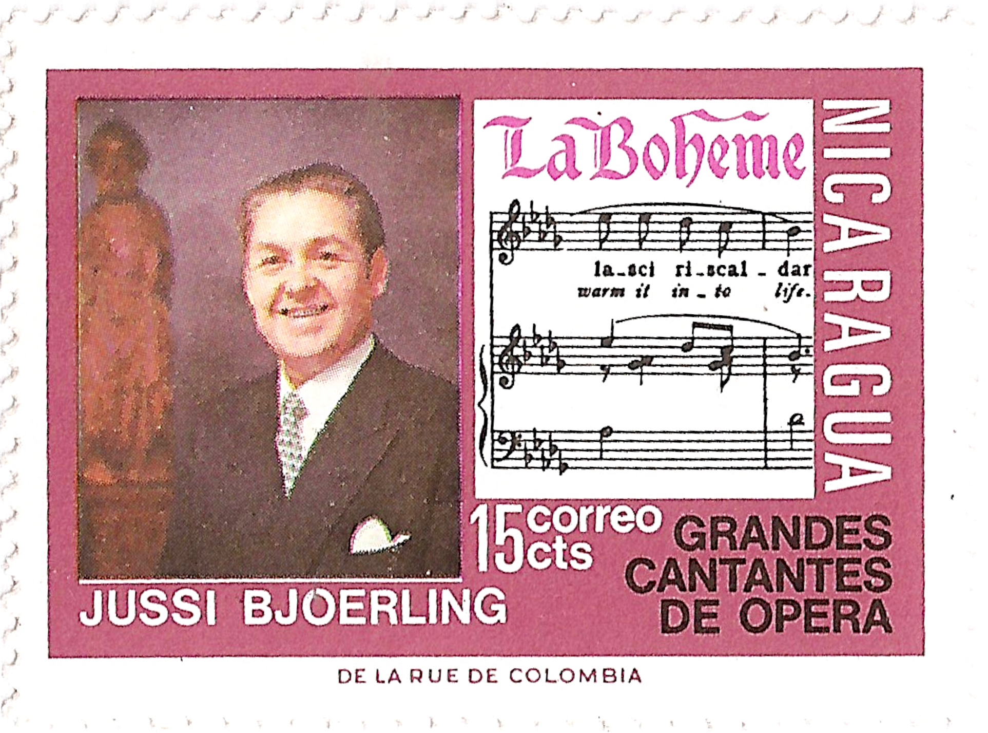 În 1975, în Nicaragua, cineva a avut ideea să tipărească o serie de 15 timbre dedicate unor mari cântăreți de operă. Seria, pe cât de singulară, pe atât de spectaculoasă, a devenit celebră în timp, până la punctul în care o biografie a lui Jussi Björling nu uită să amintească faptul că marele tenor suedez a fost imortalizat și în acest fel, prin filatelie.
