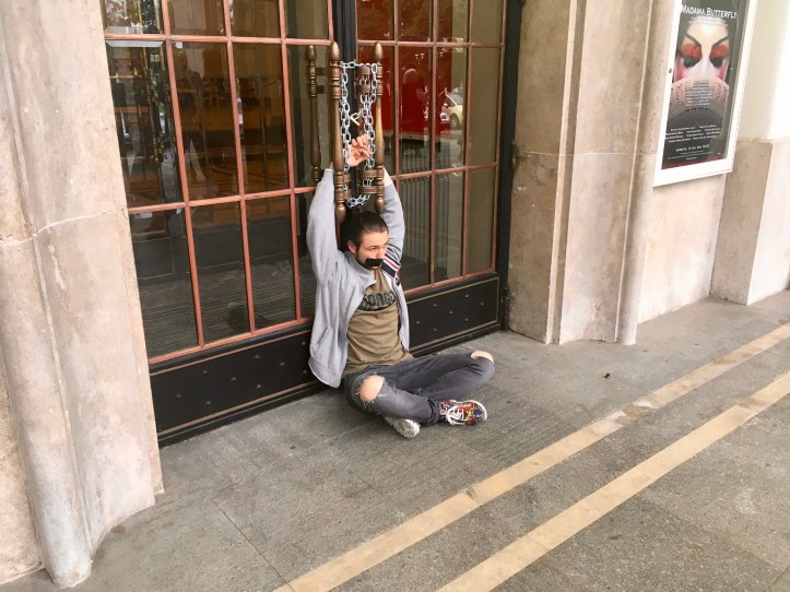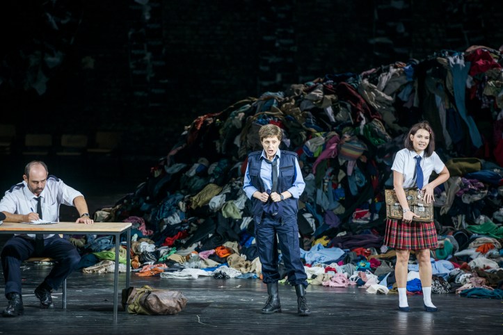 Oamenii legați cu lanțuri de masivele uși de intrare ale instituției, banner-ul negru pe care scria „Respect” și discursurile actorilor abordând teme fierbinți ale societății (ex. corupția sau familia tradițională), actori care îndrumau apoi publicul să intre prin ușa laterală, creează o atmosferă tensionată încă de la început. Dar tensionat este chiar subiectul unicei opere a lui Beethoven, în care trăim povestea unei tinere ce se travestește în bărbat și se angajează gardian într-o închisoare în care speră să-și regăsească soțul arestat în urmă cu doi ani. De aici și până la experiențele personale ale fiecărei generații de spectatori nu e decât un mic pas de făcut în imaginație. Fie că este vorba despre Holocaust, Gulag, Revoluție, mineriade, #rezist sau #colectiv, imensa valoare a regiei lui Graham Vick stă tocmai în universalitatea mesajului său, unul profund uman și perfect în acord cu idealismul lui Beethoven, acela al adevărului care triumfă și al potențialului extraordinar al omului de a se ridica mereu deasupra condiției la care vremurile vor să-l reducă. Dar despre asta am mai vorbit în cronica de la premieră (Un Fidelio pentru toate vremurile – în care veți găsi și ce înseamnă mormanul acela de haine, sau mașinile de spălat de pe scenă).