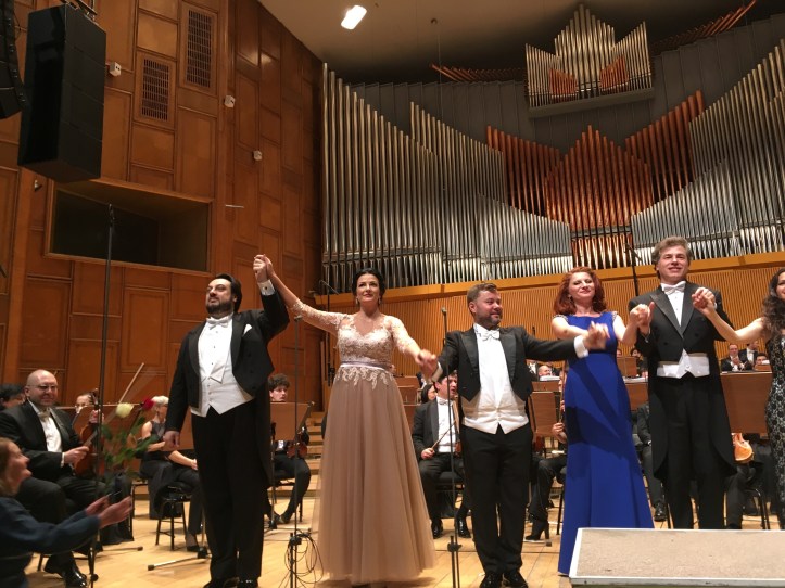 Mai departe încep însă și problemele acestui concert. Gilda utilitară a Luizei Fatyol a fost corectă vocal și expresiv, dar vocea etalată a fost tot atât de banală, având totuși meritul că a fost un bun coechipier pentru Petean, punându-l mereu în valoare. Dezamăgirea vine de la tenorul Cosmin Ifrim, complet depășit de cerințele rolului Ducelui. Problemele au fost nu doar dese, ci omniprezente odată ce s-a terminat scena balului din primul act. Timbrul e ingrat, dar asta ar fi cel mai neînsemnat defect. Probleme de intonație în Ella mi fu rapita, dublate de o dramatizare atât de exagerată încât devenea caricaturală, urmate apoi de ambiția nejustificată de a termina cabaletta Possente amor (brăzdată de alte erori de intonație, la rândul ei) cu un contra Re absolut lamentabil, cu atât mai mult cu cât era opțional. Dar a continua să înșir nemulțumirile legate de interpretarea sa ar însemna să le retrăiesc, așa că mă opresc. Nu înainte de a mă întreba de ce Orchestra Națională Radio continuă să-l invite an după an? A fost un Fernando slab în La favorita din 2016, un Gabriele Adorno încă și mai slab în Simon Boccanegra din 2017, iar acum a fost mai rău ca niciodată în Rigoletto. Cu atât mai mult cu cât, pentru rolul Ducelui, chiar se găsesc destui tenori net mai buni decât el, chiar și din țară. Cristina Damian a rezolvat cu eficacitate rolul Maddalenei, ajutată și de o prezență fizică memorabilă, ce a compensat limitările vocale, însă Sparafucile a fost cel care a strălucit cu adevărat lângă ea, Petre Burcă etalând o voce de bas în care puțina substanță rămasă era utilizată perfect în exprimarea unui cinism memorabil.