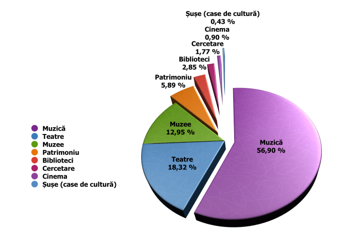 Dacă veți avea curiozitatea să consultați fișierul excel denumit File de plan 2017 postat public pe website-ul ministerului culturii, veți afla că instituțiile subordonate acestuia sunt subvenționate cu o sumă totală de 125 milioane €. Statele Unite ale Americii nu au un minister al culturii, dar statul federal acordă totuși subvenții printr-un organism numit NEA (National Endowment for the Arts), în valoare totală de cca 97 mil. € (118,37 mil. $). Granturile sunt simbolice, având în vedere că ele trebuie împărțite între 51 de state, toate mai mari decât România. Însă ele servesc ca o certificare a calității unui act cultural. Pe baza lor se pot obține mai ușor donații de la sponsori. Chiar și așa, cu greu am putea spune că România nu sprijină financiar cultura. Dar o face prost, ineficient și fără nici o monitorizare a calității sau vreo evaluare a rezultatelor.  Dar cum sunt alocați acești bani? Dacă ați citit vreodată un interviu cu un ministru al culturii român, impresia directă este că toate eforturile sunt concentrate pe patrimoniu, cinematografie și, eventual, muzee. Realitatea este însă cu totul alta și o puteți privi în față în imaginea alăturată, căci feliile acestui tort de 125 mil. € sunt împărțite cu totul altfel decât arată temele de interes ale miniștrilor culturii: