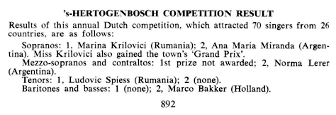 Prima mențiune e în Noiembrie 1966, când revista Opera consemnează lista câștigătorilor concursului anual de canto ‘s Hertogenbosch din Olanda (azi se numește IVC). Marina Krilovici a câștigat atunci primul loc la secțiunea pentru soprane și „Grand Prix” al orașului Den Bosch. Ludovic Spiess a câștigat primul loc la categoria tenorilor. Nu e puțin lucru, acest concurs fiind punctul de plecare al multor cariere importante și merită să amintesc o scurtă listă a celor mai notorii câștigători: Elly Ameling, Thomas Hampson, Petra Lang, Ileana Cotrubaș, Viorica Cortez, Nelly Miricioiu, Yevgeny Nesterenko sau Pretty Yende.