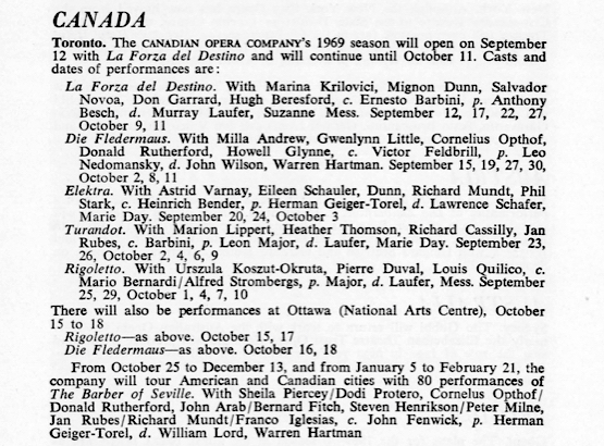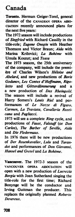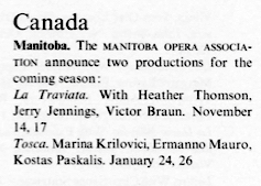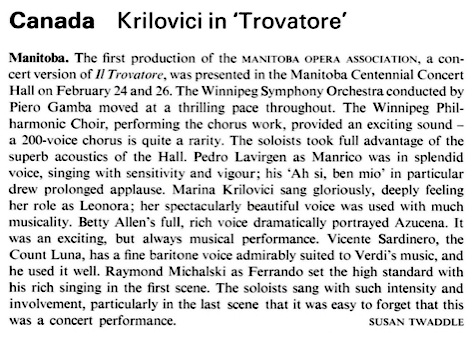 În Iunie 1972, corespondenta revistei Opera în Canada, Susan Twaddle, publică o cronică la Il trovatore la Manitoba Centennial Concert Hall din 24 și 26 Februrie, în concert: