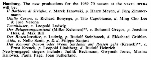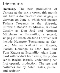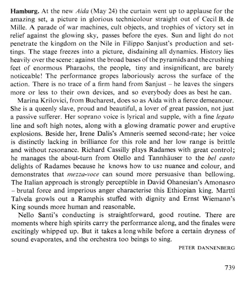 O primă cronică de la Hamburg apare în August 1970, pentru un spectacol cu Aida din luna Mai a aceluiași an, și tot în acel număr, la rubrica „We hear that…” („Am auzit că…”), publicul britanic afla că în anul următor Krilovici va cânta în Aida la Covent Garden, în ceea ce va fi poate cel mai important succes de critică al ei. Revenind la cronica de la Hamburg, criticul Peter Dannenberg observă că producția lui Filippo Sanjust nu are nici o profunzime psihologică, urmărind doar să impresioneze vizual printr-o scenografie „uimitoare”, demnă de superproducțiile hollywoodiene ale lui Cecil B. de Mille, lăsând cântăreții să se descurce pe scenă cu mecanismele dramatice tipic operatice.