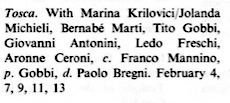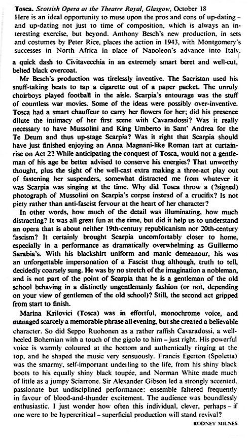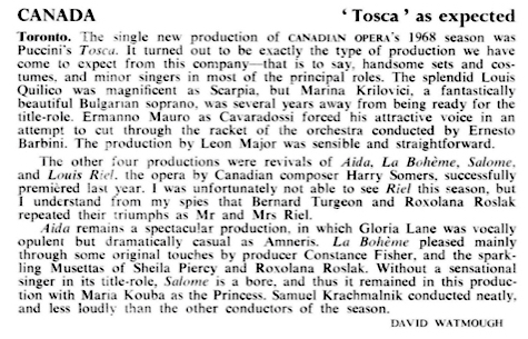 Splendidul Louis Quilico a fost un Scarpia magnific, dar Marina Krilovici, o soprană bulgară fantastic de frumoasă, este încă la ani distanță de a fi pregătită pentru rolul titular.