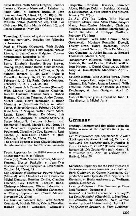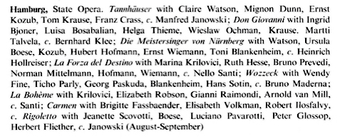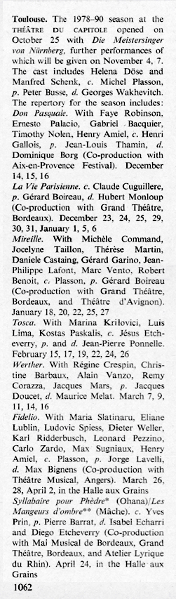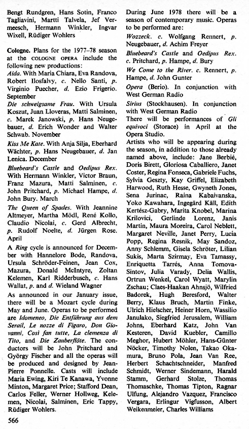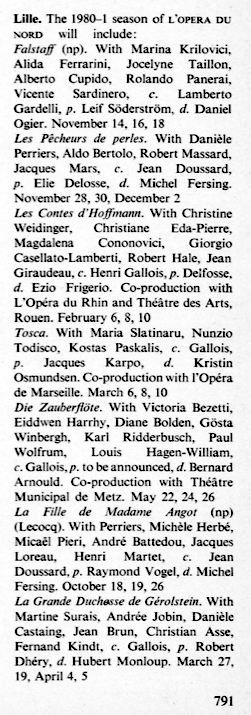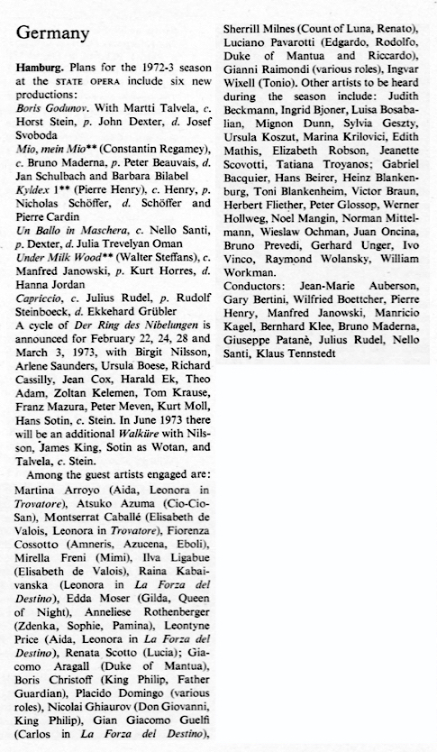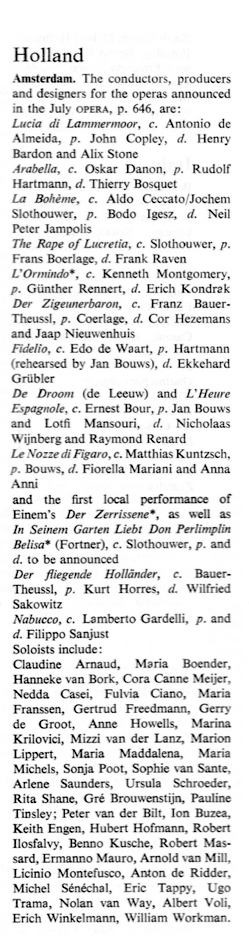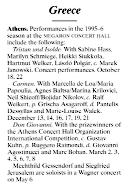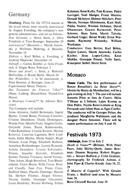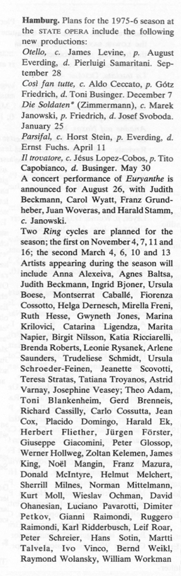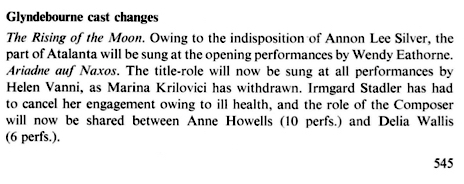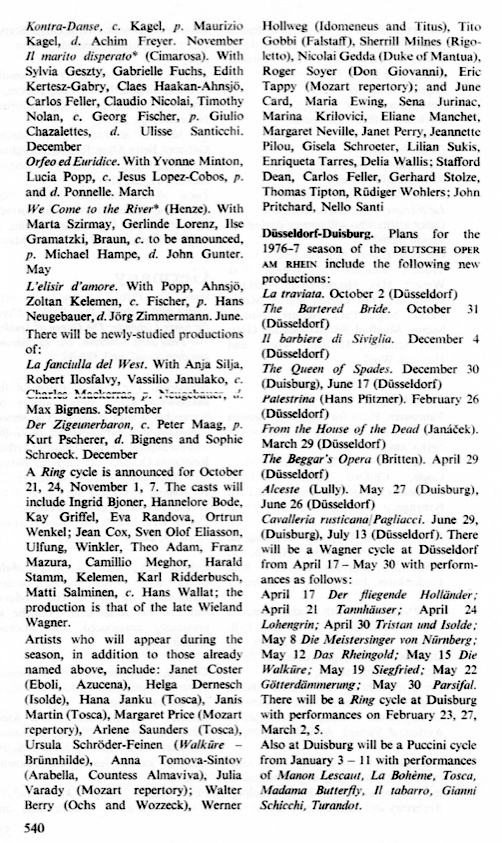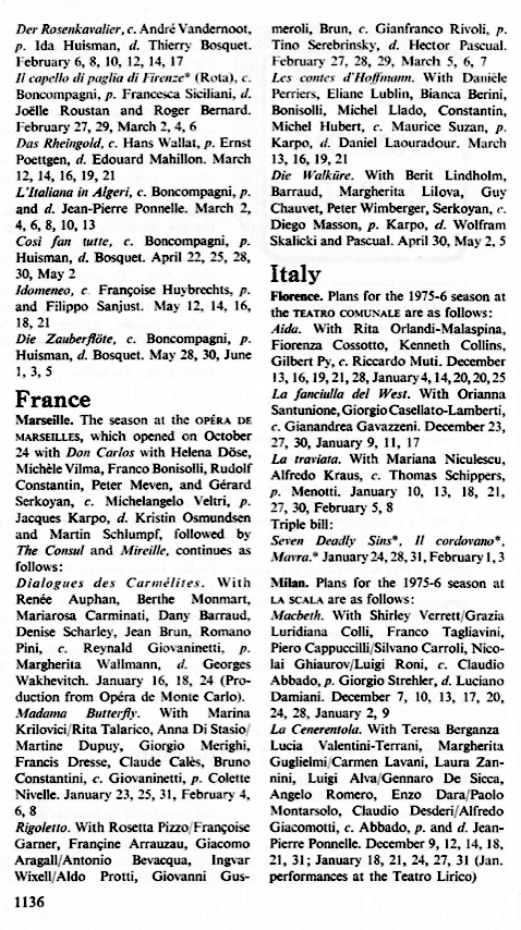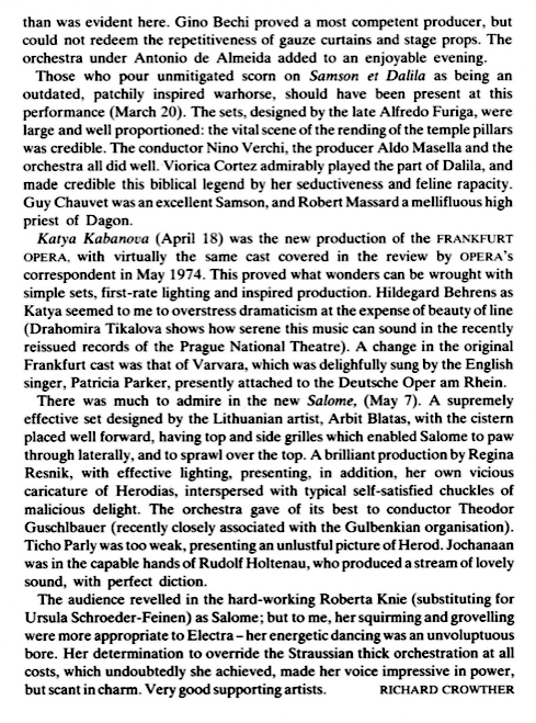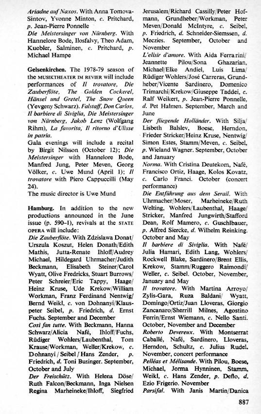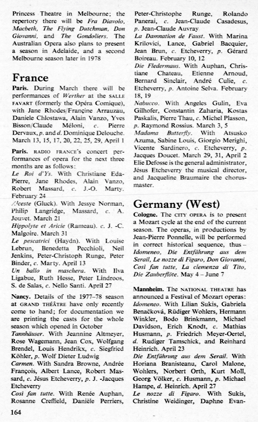 În rest, anunțuri: pe lista de artiști invitați la Köln (în 1976 și în 1977), Marguerite din La damnation de Faust la Nancy, din nou Elisabeth di Valois din Don Carlo, la Monte Carlo (în 1978, conform unui ad de presă), Tosca la Toulouse (1979), Glasgow (1980, cea recenzată mai devreme) și Tours (1988), Nanetta din Falstaff la Lille (1980), Cio-Cio-San la Montreal (1981) și două mențiuni într-un articol despre discografia lui DerFreischütz semnat de Alan Blyth („vibrantă, deși nepotrivită” în rolul Agathei) și un altul, la rubrica „People”, despre cariera regizorului Michael Hampe.