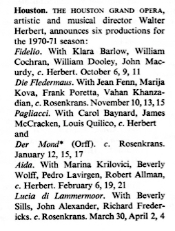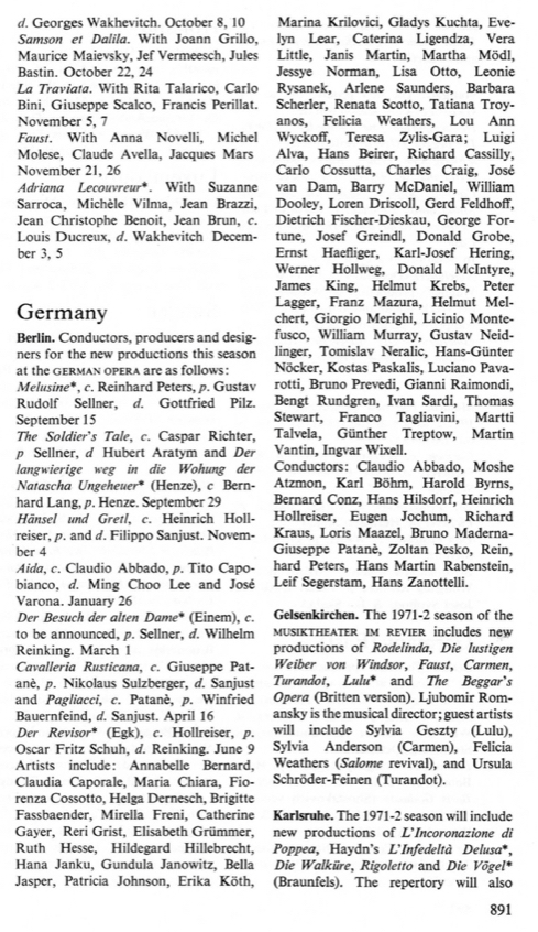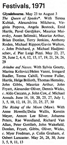 În Martie 1971 e anunțată în Ariadna auf Naxos de la Glyndebourne, dar în Iunie aflăm că a anulat, fiind înlocuită de Helen Vanni. În August 1971 e anunțată în lista invitaților de la Opera Toronto (tot Aida), în Octombrie e anunțată în cea de la Deutsche Oper Berlin, iar afișele publicitare de la Covent Garden din August și Septembrie o menționează pe ea și pe Shirley Verrett (cu Viorica Cortez în distribuția alternativă) ca atracțiile principale ale Aidei.