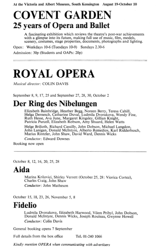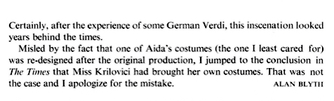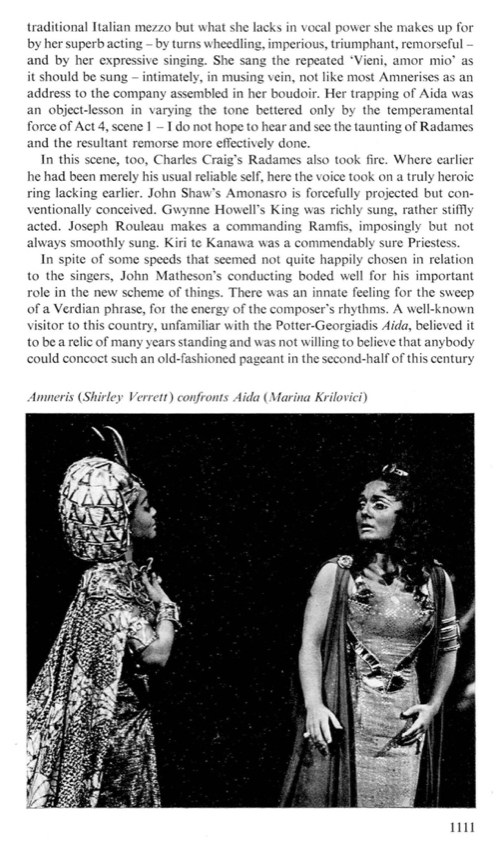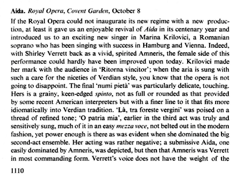 Dacă noul regim de la Royal Opera nu a putut fi inaugurat de o premieră, cel puțin a programat o reluare plăcută a Aidei, cu ocazia aniversării centenarului acestei opere, și a făcut cunoștință publicului cu o nouă și entuziasmantă artistă în persoana Marinei Krilovici, o soprană de succes la Hamburg și Viena. Într-adevăr, alături de Shirley Verrett, o Amneris plină de viață și spirit, distribuția feminină a acestui spectacol cu greu ar putea fi depășită astăzi. Krilovici a marcat publicul în Ritorna vincitor; când aria asta este cântată cu atâta grijă pentru frumusețile stilului verdian, știi sigur că opera nu te va dezamăgi. În special numi pieta din final a fost redată, în mod particular, delicat și emoționant. Spinto-ul ei este granulat și ascuțit ca o lamă, nu atât de rotund precum cel al unor recente interprete americane, dar având o linie mai frumoasă care se potrivește mai idiomatic tradiției verdiene. Là, tra foreste vergini a fost înșirată pe un fir de tonalități rafinate; O patria mia, de la începutul actului trei, a fost cântată cu sinceritate și sensibilitate, în mare parte într-o ușoară mezza voce, nu așa forțată cum e la modă acum, totuși suficient de puternic încât să fie evidentă atunci când domina marele ansamblu din actul al doilea. Jocul de scenă a fost mai degrabă negativ; a descris o Aida supusă, una dominată ușor de Amneris, dar să ținem cont că Amneris era Verrett în cea mai autoritară formă.