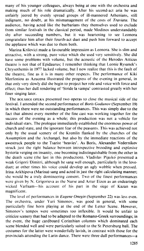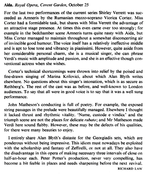 Richard Law comentează apoi, la fel de încântat, spectacolul din 25 Octombrie, când Viorica Cortez a înlocuit-o pe Shirley Verrett în rolul lui Amneris, însă ceea ce ne interesează în acest articol este comentariul despre Marina Krilovici: