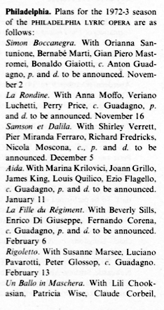 Drumul continuă și în anul 1972 la cote înalte. În Martie e anunțată la Chicago, Lyric Opera fiind al treilea teatru de operă din Statele Unite, după Metropolitan și San Francisco, iar în Mai aflăm și ce va cânta: Mimì, pentru ca în August să fie anunțată la Philadelphia, din nou Aida.