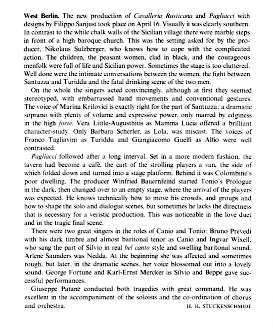 Ne reîntâlnim la Berlin cu Filippo Sanjust, autorul producției apreciate de critică, iar în rolurile principale cântau Franco Tagliavini (Turridu) și Giangiacomo Guelfi (Alfio) – „ale căror voci au contrastat foarte bine”, însă Vera Little-Augusthitis a impresionat cel mai mult în rolul Luciei – „oferind un strălucitor studiu de personaj”.