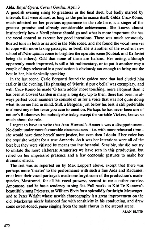 În Octombrie 1971 începe seria spectacolelor cu Aida de la Royal Opera House, cu un succes atât de mare, încât în numărul pe luna Decembrie, Opera Magazine îi rezervă spațiu pentru două cronici, prima, semnată de unul dintre criticii seniori ai publicației, Alan Blyth, ocupând trei pagini (le puteți accesa aici: 1, 2, 3), în timp ce a doua, aparținând lui Richard Law, comentează distribuția a doua. Blyth e cucerit, după spectacolul din 8 Octombrie 1971: