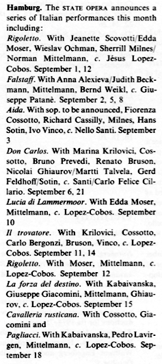 Dirija Nello Santi, „rutinier, direct, dar foarte bun”. Amonasro era Ohanesian („forță brută și mânie imperativă”, iar Ramfis era Martti Talvela („plin de demnitate”), dintre numele cu rezonanță pe la noi. Amneris era Irene Dalis („de mâna a doua”), iar Radames era Richard Cassilly, cel care cânta cu succes atunci la Hamburg în Otello și Tannhäuser („știind să facă uz de nuanță și culoare și demonstrând că mezza-voce poate suna mai convingător decât urletul”).