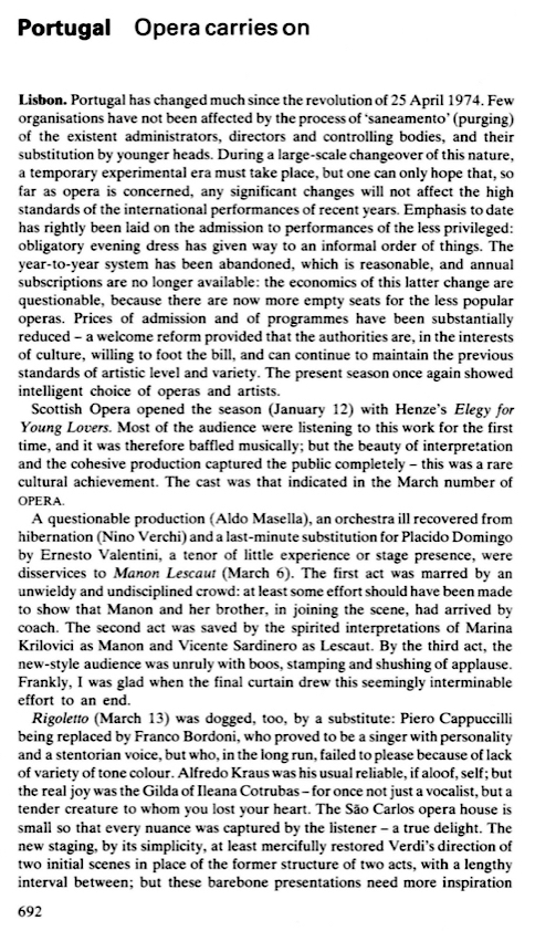 Însă comportamentul publicului portughez nu poate fi pus exclusiv pe seama calității spectacolului. Cu un an mai devreme, Portugalia trecuse printr-o nouă lovitură de stat ce a instaurat „A Treia Republică”. Societatea era atinsă de epurări ale apropiaților fostului regim Salazar, iar opera trecea printr-o reformă în care se urmărea deschiderea către un public cât mai larg prin eliminarea abonamentelor și scăderea prețurilor, în condițiile în care se încerca menținerea unor standarde artistice la fel de ridicate. În fine, aceasta este singura cronică referitoare la Krilovici în acest an, pe lângă anunțurile unor noi colaborări cu ansamblul operei din Hamburg, apoi pentru rolul pe care-l cântă tot mai des, Cio-Cio-San, la Marseille și Dallas (unde va anula, ulterior), și Tatiana la Strasbourg, de unde avem și o cronică pentru spectacolul din Ianuarie 1976, semnată de un mare critic francez, André Tubeuf, care comentează sever stagiunea: