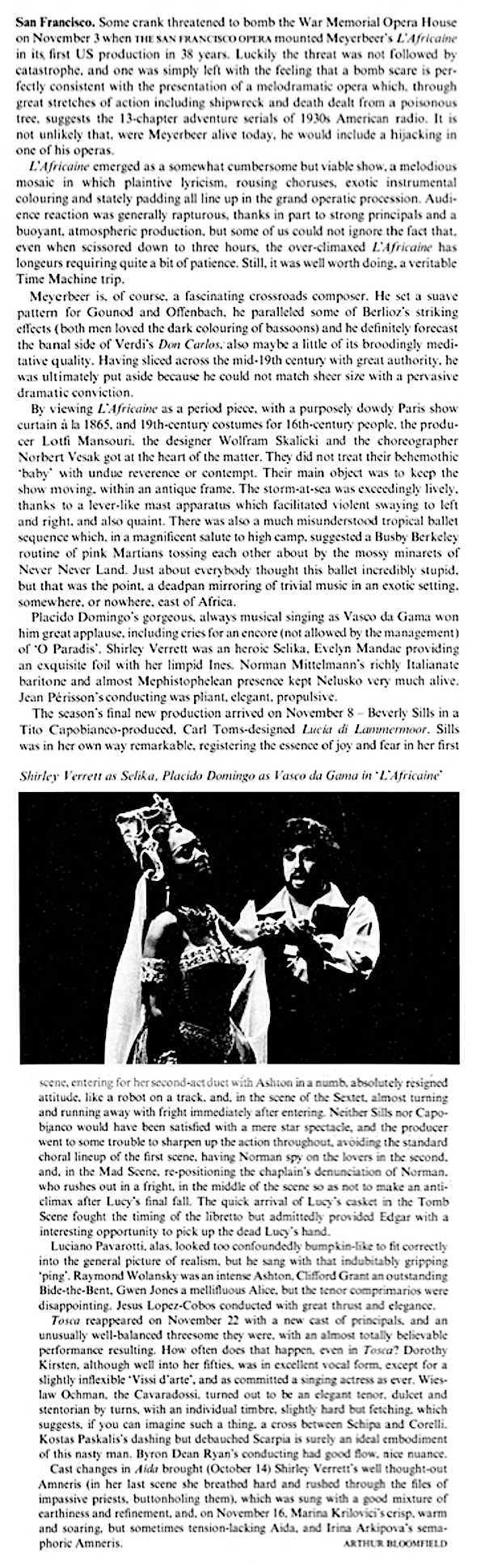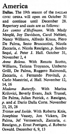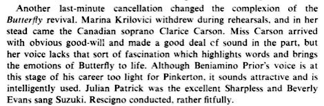 Butterfly a fost notabilă numai pentru debutul american al lui Riccardo Chailly, un dirijor de 21 de ani, care a adus tot sentimentalismul, pasiunea și tragedia atât de admirabil puse în partitură de Puccini, și totuși reușind să păstreze curgerea fluentă a operei. Marina Krilovici, Cio-Cio-San, a fost atașantă de ascultat, dar inconfortabilă de văzut; s-a agitat deliberat, devenind credibilă abia când s-a așezat, la sfârșit, cu băiețelul cuibărit în poală, atunci când se pregătea să se înjunghie, cu vervă și fler. Restul distribuției a fost, în cel mai bun caz, utilă. (Peter Jacob)