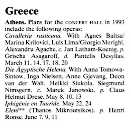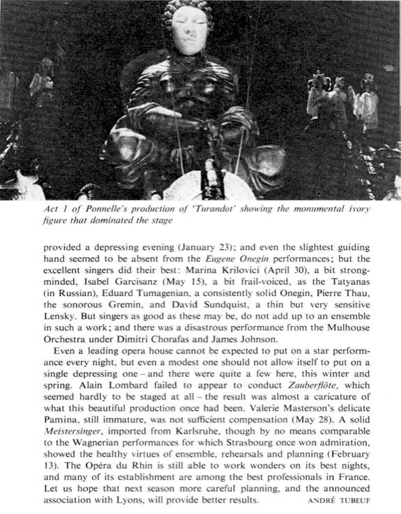 Nici cea mai mică intenție de coordonare nu s-a putut observa în spectacolele cu Evgheni Oneghin; dar excelenții artiști invitați și-au dat toată silința: Marina Krilovici (pe 30 Aprilie), un pic prea accentuată, și Isabel Garcisanz (pe 15 Mai), un pic fragilă vocal au fost Tatiana (cântând în rusă), Eduard Tumagian fiind un consistent și solid Oneghin […]. Dar oricât de buni ar fi soliștii, ei nu pot compensa pentru un ansamblu în această operă; iar performanța celor de la Mullhouse Orchestra, sub Dimitri Chorafas și James Conlon, a fost dezastruoasă.