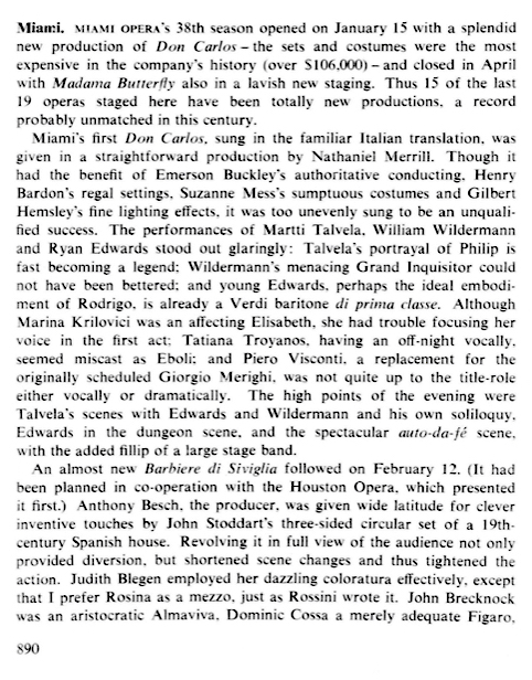 Ceea ce n-a fost urât a părut în schimb deplasat, cu Viorica Cortez într-un vulgar număr de „star” care n-a plăcut nimănui mai mult decât ei însăși. James King în Don José a fost un fel de funcționar senior lipsit de pasiune, a cărui voce, de-a lungul întregului rol, și-a piedut strălucirea. Lorenzo Saccomani l-a cântat pe Escamillo tinerește, într-o franceză italienizată, dar n-a fost în realitate decât un toreador, nu un matador nici ca aparență, nici ca mișcare. Competentul dirijor Jésus Lopez-Cobos nu a avut la dispoziție pe scenă decât un singur artist demn de această operă, Marina Krilovici. Atunci când te trezești că anticipezi apariția și re-apariția Micaëlei, știi că a fost o Carmen ratată.