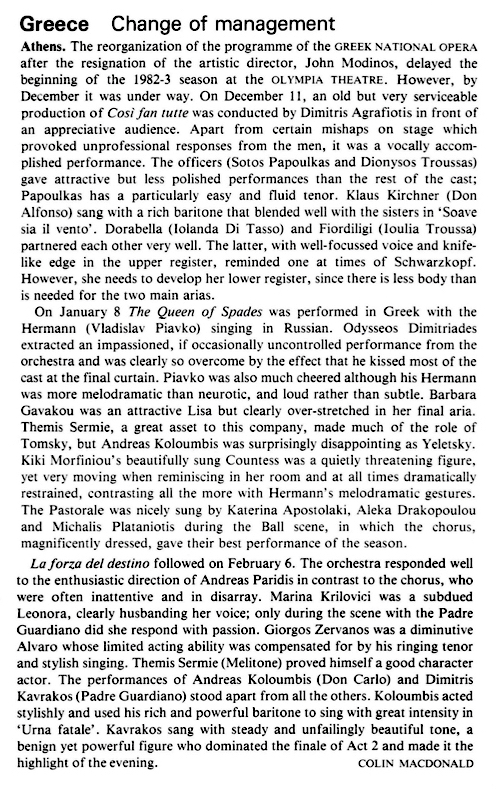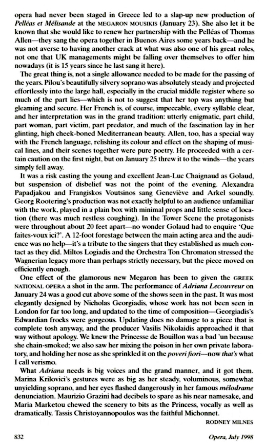 Începând cu anul 1982, Marina Krilovici se apropie tot mai mult de Opera din Atena, cu care colaborează progresiv, apoi permanent până la sfârșitul anilor ’90. Un ansamblu cel puțin onorabil, în care soprana devine un membru important. De aici, corespondenții Opera Magazine, Colin Macdonald, David Turner și redactorul șef al publicației, Rodney Milnes vor transmite ultimele patru cronici despre Marina Krilovici. Toți recunosc tehnica, experiența și arta sopranei, observând cu delicatețe și tributul pe care timpul l-a cerut după o carieră internațională de peste trei decenii.