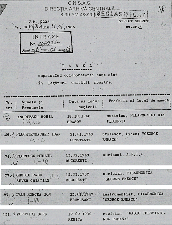 1. În dreptul numelui unora stă scris cu creionul NU, semn că au fost verificați și răsverificați. Primul care a reacționat la articolul de mai sus a fost Ioan Aurel Pop, proaspăt alesul președinte al Academiei Române. Susține că nu a fost turnător.