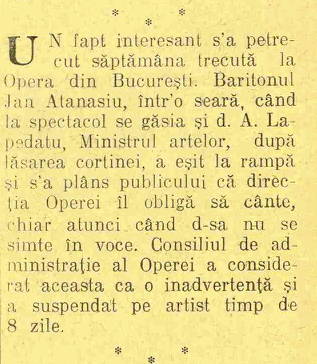„Un fapt interesant s’a petrecut săptămâna trecută la Opera din București. Baritonul Jan (sic!) Atanasiu, într’o seară, când la spectacol se găsia și d. A. Lapedatu, Ministrul artelor, după lăsarea cortinei, a eșit la rampă și s-a plâns că direcția Operei îl obligă să cânte, chiar atunci când d-sa nu se simte în voce. Consiliul de administrație al Operei a considerat aceasta ca o inadvertență și a suspendat pe artist timp de 8 zile.” (Realitatea ilustrată, Noiembrie, 1927)