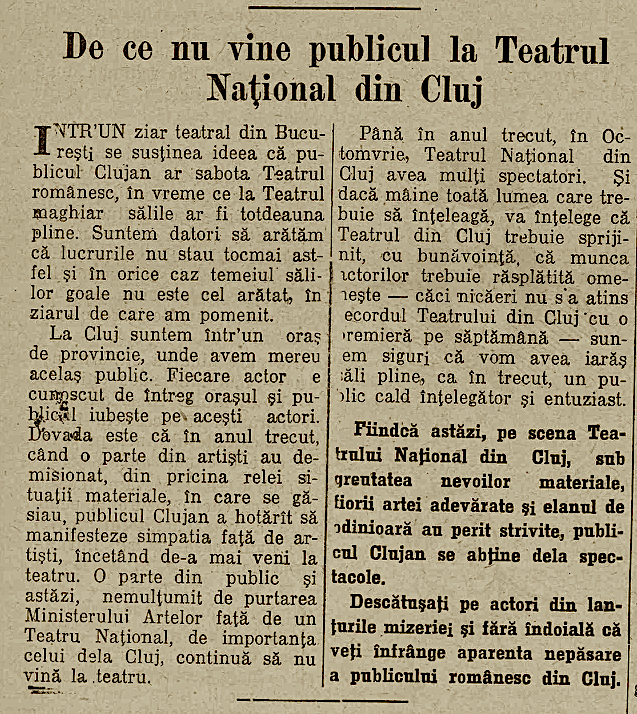 Nu voi să aduc reproșuri nimănui; dar realitatea trebuie s’o văd în ochi. Deocamdată voi să înlătur două cauze ale tristei realități a teatrului clujan: