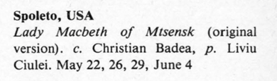 În 1936, pe lângă personajele din operă, pe lista victimelor Katerinei Ismailova era cât pe-aci să fie înscris și autorul, la un pas de Gulag când oficiosul Pravda a titrat anonim: „Haos în loc de muzică” după ce Stalin a asistat la un spectacol cu Lady Macbeth. În plin război rece, Christian Badea dirijează memorabil la Spoleto și la Charleston în producția unui mare regizor de teatru aflat la debut în operă, la fel de stimulat și el de muzica lui Șostakovici: Liviu Ciulei. O punere în scenă sumbră, cu decoruri din lemn (create de soții Boruzescu), care trosneau la rotirile turnantei, în care cadavrul lui Zinovei apare nud pentru a fi spălat ritualic, iar în scena din lagărul siberian, la apelul de seară, gardianul  latră numele membrilor sovietului suprem, pe post de nume de deținuți. Dar despre aventura lui Liviu Ciulei în lumea operei (la fel de interesantă ca cea a lui Lucian Pintilie) într-un articol viitor. Spectacolul are mare succes și, în cronica publicată în numărul pe luna Noiembrie al revistei Opera, intitulată „Cealaltă «Lady»”, Christian Badea e remarcat la superlativ.