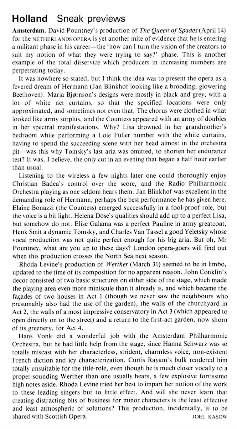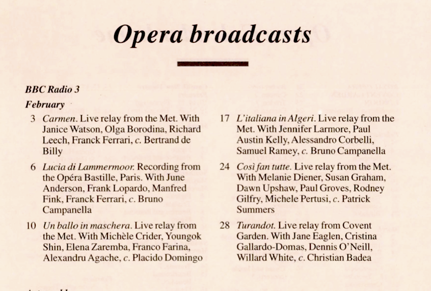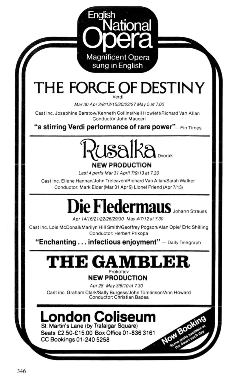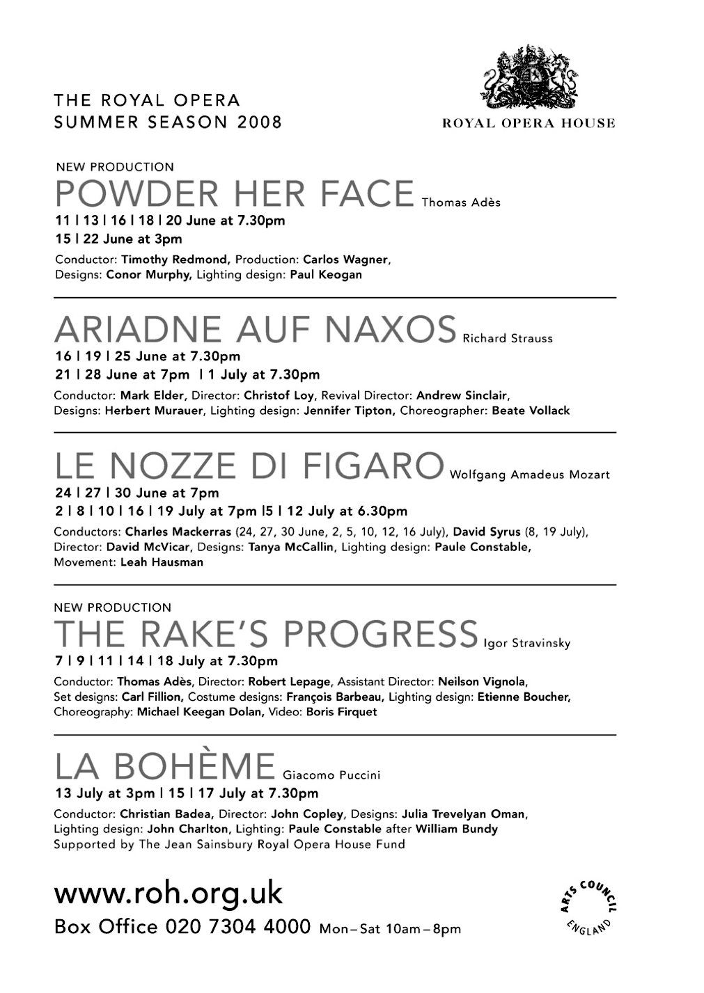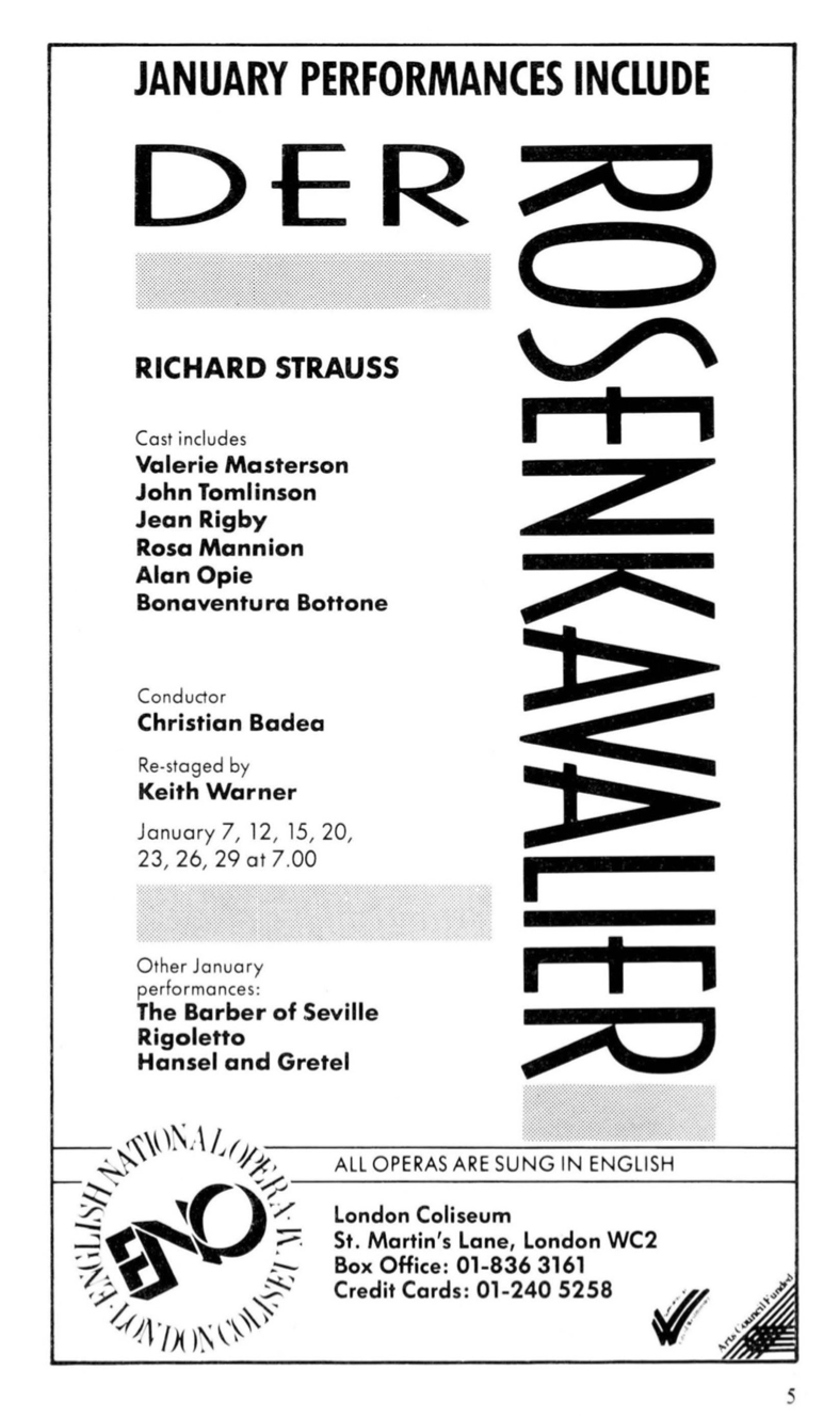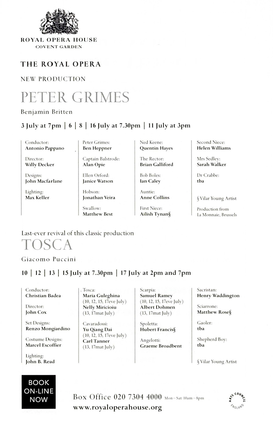 Vor fi ultimele spectacole de la Covent Garden înainte de închiderea teatrului pentru renovare și extindere, un proiect a cărui finanțare provenind din câștigurile loteriei naționale a provocat un scandal în lumea muzicală britanică, ce a condus la o lungă și tumultuoasă reformă a instituției, încheiată odată cu redeschiderea clădirii pentru public. Au fost cinci ani de restructurări, numeroși interimari, printre care, la un moment dat, din lipsă de candidați, însuși secretarul de stat pentru cultură al Marii Britanii (echivalentul ministrului de la noi, căci Anglia nu are un portofoliu separat pentru cultură), în timpul cărora însăși arta operei părea pierdută, dar la capătul cărora Covent Garden a devenit ceea ce este azi: unul dintre cele mai importante teatre lirice de pe glob. Simbolic, la capătul acestei reforme, editorul șef al revistei Opera, Rodney Milnes, demisionează și îl numește succesor pe John Allison. Este modul în care britanicii, atât muzicienii cât și criticii, înțeleg să încheie o epocă, pentru a face loc viitorului.