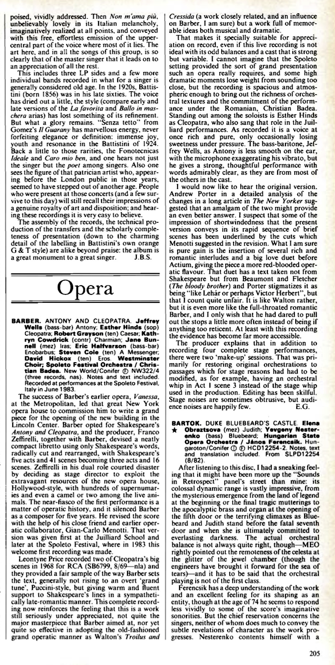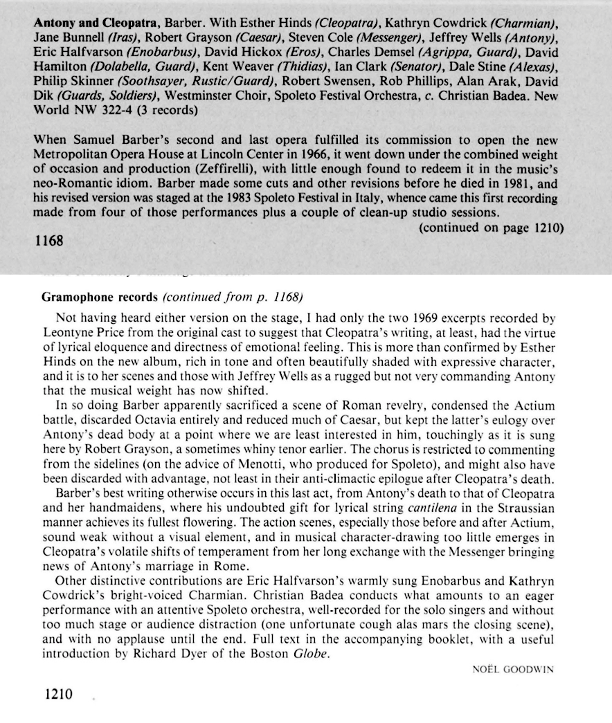 Antony and Cleopatra e o altă poveste memorabilă de la Spoleto, ale cărei detalii le puteți citi în interviul pe care mi l-a acordat Christian Badea acum doi ani. Compusă de Samuel Barber pentru inaugurarea noii clădiri a Met-ului din Lincoln Center, premiera a fost un fiasco în ciuda tuturor circumstanțelor favorabile: Franco Zeffirelli asigura regia, decorul și costumele, dar și libretul, ce se limita la replici din piesa lui Shakespeare, și nici măcar distribuirea lui Leontyne Price în rolul Cleopatrei nu a putut împiedica dezastrul. Iar Barber a fost atât de afectat, încât a abandonat compoziția vreme de cinci ani. Menotti a insistat și a revizuit opera împreună cu Barber, iar Festivalul de la Spoleto a produs reparația morală când a reluat-o. Înregistrarea a fost publicată pe disc și a primit premiul Grammy pentru muzică contemporană în 1985. Recenziile discului din Opera Magazine și Gramophone remarcă aceeași determinare a orchestrei, propulsându-l definitiv pe Christian Badea în lumea marilor teatre de operă.