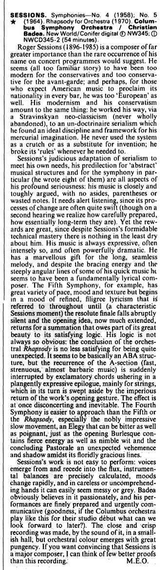 „Lucrările lui Sessions nu sunt ușor de interpretat: vocile se înalță pentru a se scufunda apoi în fluxul sonor, balansul instrumentelor e calculat precis, stările de spirit se schimbă rapid și, în mâini neglijente sau neînțelegătoare, muzica lui poate suna confuz și cenușiu. Badea crede în el cu pasiune și interpretările sale sunt bine pregătite și urgent comunicative.