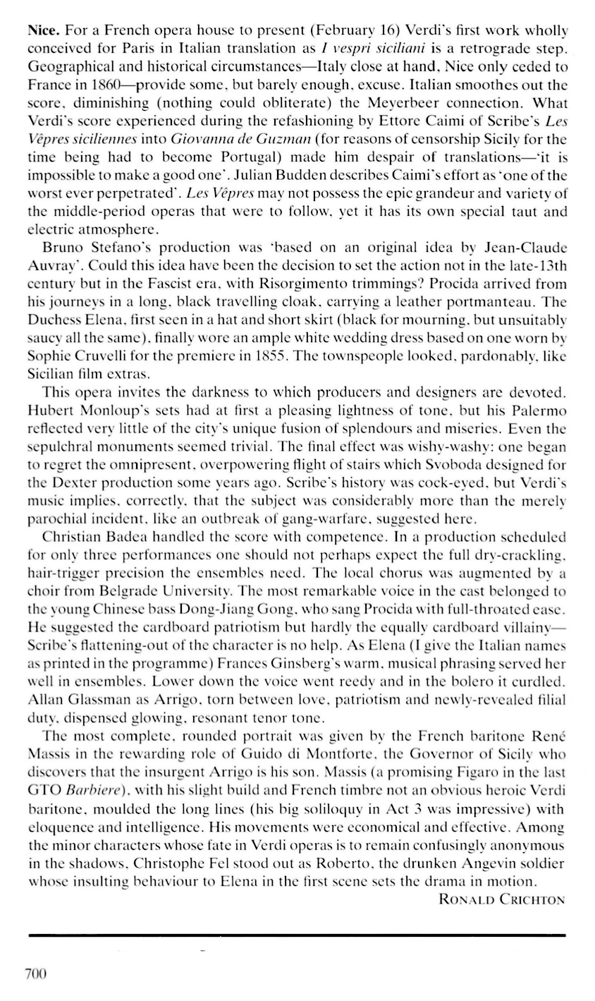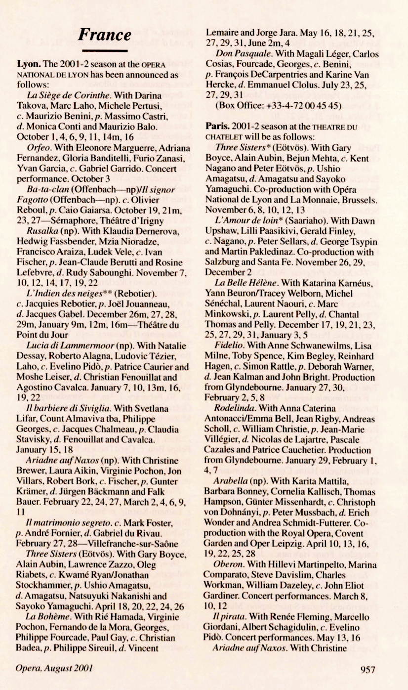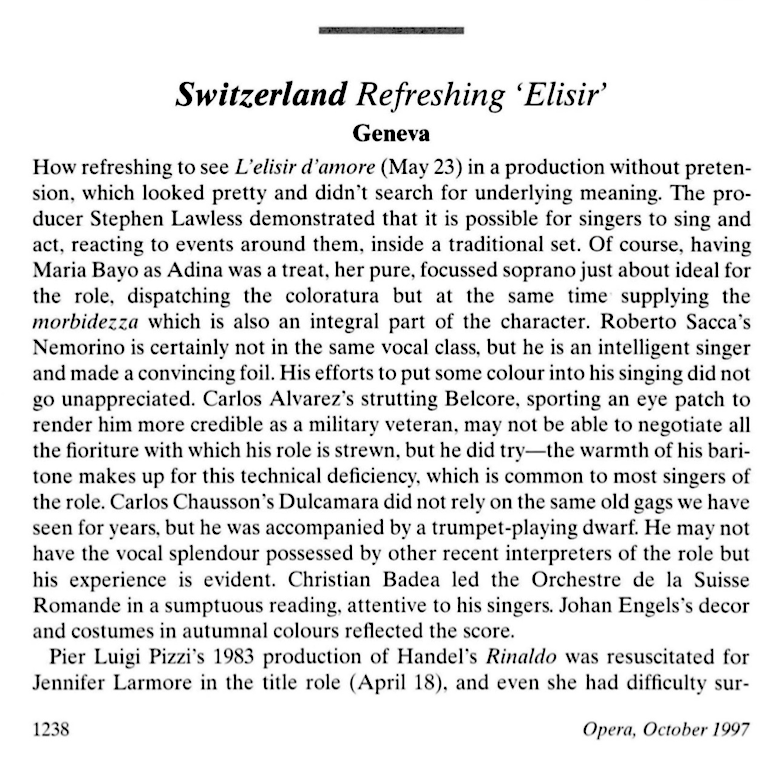 În zona francofonă, povestea începe la Nice, în 1992, cu I vespri siciliani dirijat „competent” (trei spectacole cu producția lui Auvry ce muta acțiunea din libret în perioada fascismului italian), continuând la Geneva, în 1996, cu un Elisir d’amore plin de prospețime, „Christian Badea conducând L’Orchestre de la Suisse Romande într-o lectură somptuoasă, atentă la cântăreți” (erau Maria Bayo, Roberto Sacca și Carlos Álvarez), însă teatrul de operă francez în care va fi invitat cu regularitate este cel de la Lyon, prima serie de șase spectacole fiind Falstaff, cu José van Dam, în regia lui Willy Decker. Voi reveni asupra serilor de la Lyon (al doilea oraș al Franței după Paris), însă deocamdată…