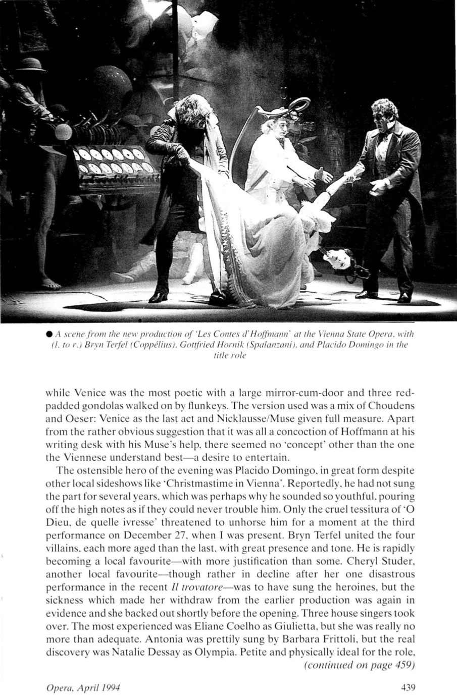 În 1993, sezonul vienez începe cu un eșec neașteptat al producției lui István Szabó pentru Il trovatore. Tensiunea atinge cote paroxistice înaintea următoarei premiere, cea a operei lui Offenbach. Andrei Șerban e regizor, Nicky Wolcz e scenograf, dirijor e Christian Badea. În afară de Plácido Domingo, restul distribuției e formată din tineri foarte talentați la acea vreme, dar departe încă de statutul de vedetă: Natalie Dessay, Barbara Frittoli, Bryn Terfel. E un triumf. Ioan Holender trece de acest hop și va fi reconfirmat ca director al Operei din Viena, iar producția lui Andrei Șerban a rămas în repertoriu, adunând, până azi, 88 de reprezentații, premiera și încă alte zece fiind dirijate de Christian Badea.