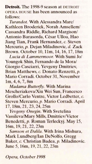 America rămâne în agenda dirijorului, cu Tosca la Cincinatti (1998, cu Carol Vaness și Franco Farina) și la Opera Pacific din Costa Mesa, în 2005 („tensionată, mereu intensă”), după ce debutase tot aici într-o La bohème îmbrățișând cu „texturi impresioniste și diafane” pe Leontina Văduva și Marcello Giordani în rolurile îndrăgostiților Mimì și Rodolfo. În fine, la Detroit, unde deschide sezonul în 1999 cu Samson et Dalila, revenind „cuceritor” în 2013 pentru primul Fidelio din istoria companiei, cu o Christine Goerke impresionantă în rolul titular.
