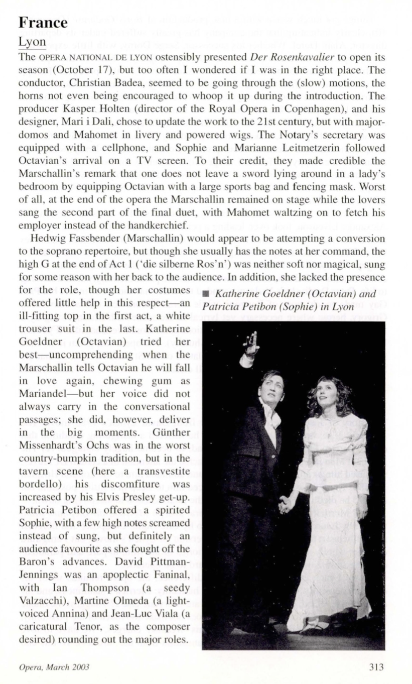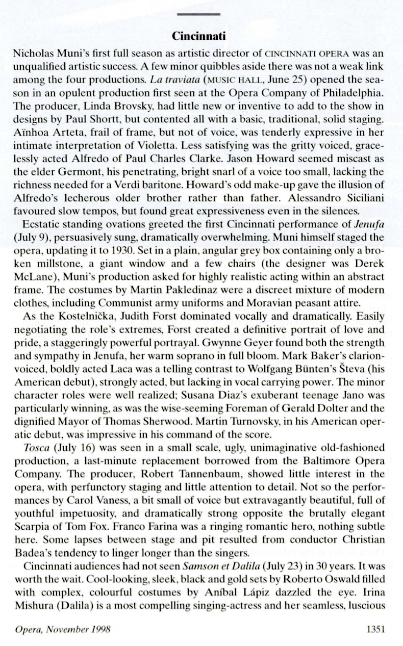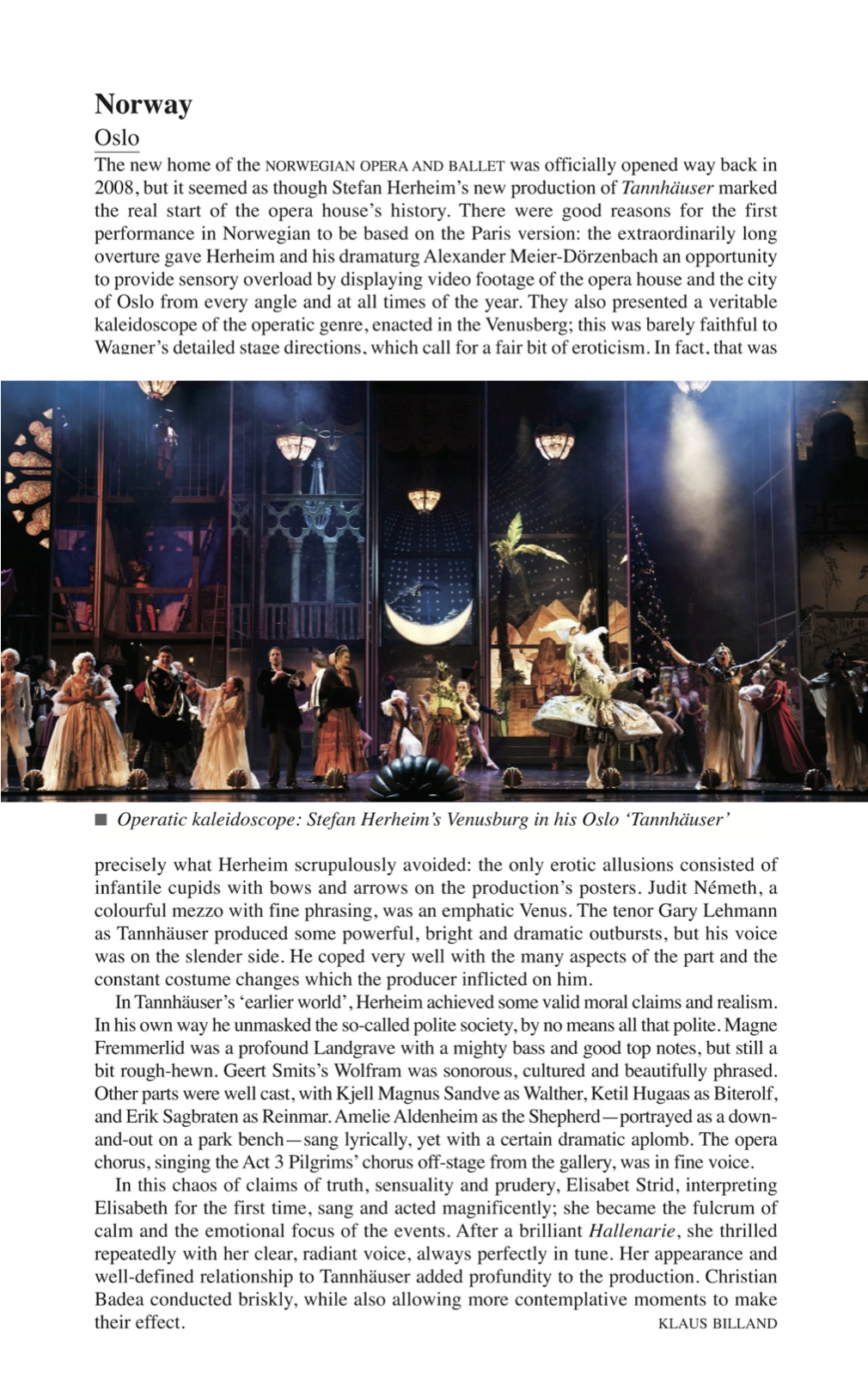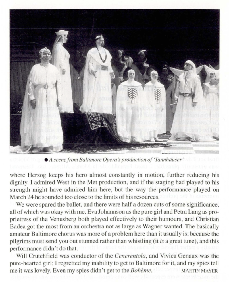 1. Iata o cronica a operei Tannhauser, spectacolul de la Baltimore in regia lui Werner Herzog: http://www.washingtonpost.com/wp-srv/WPcap/2000-03/18/068r-031800-idx.html?noredirect=on. Inca mai am amintiri placute asupra acestei reprezentatii.