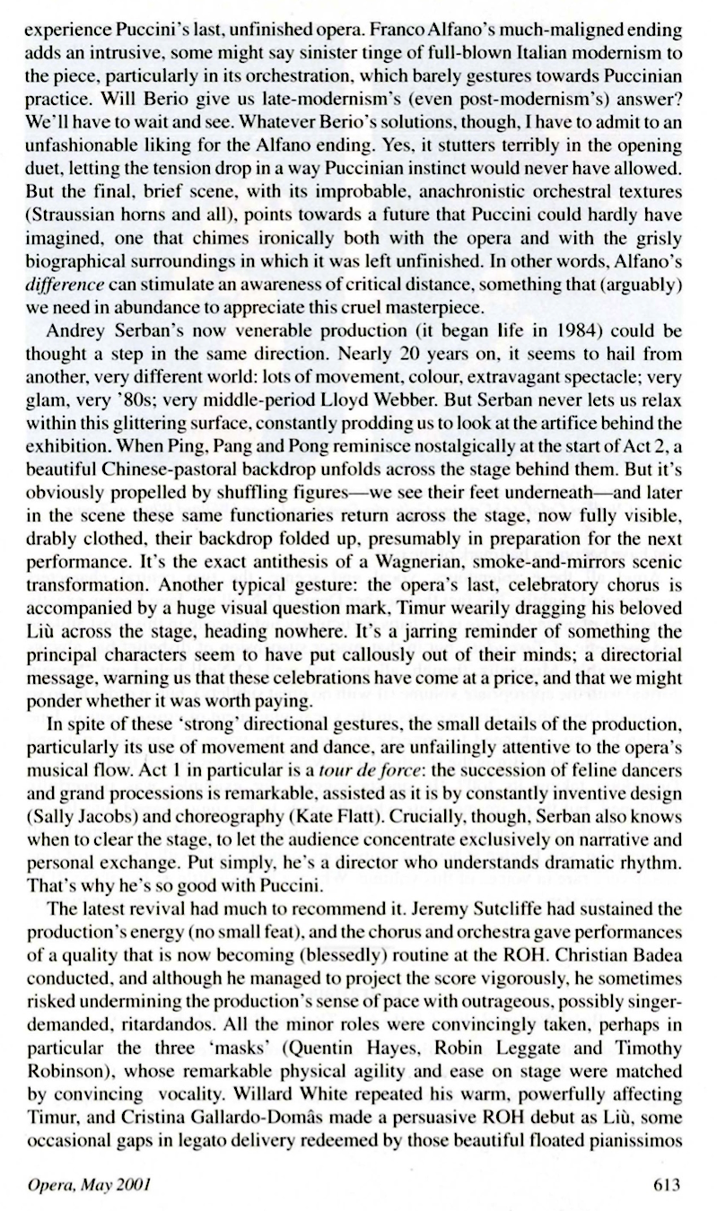 E invitat la noul Covent Garden în 2001, pentru Turandot (producția lui Andrei Șerban). Dirijează, „viguros” în opinia criticilor, versiunea terminată de Luciano Berio, în premieră la Londra, în locul tradiționalului, dar mult contestatului final al lui Alfano. Jane Eaglen și Simon O’Neill sunt doi (prea) impozanți Turandot și Calaf, în timp ce Liù e Cristina Gallardo-Domâs, o soprană lirică în plină ascensiune în acei ani.