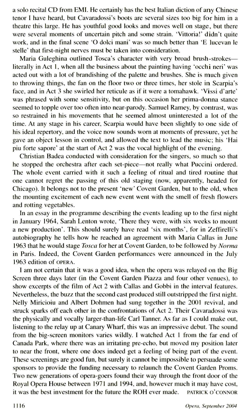Apoi, în Iulie 2004, pentru un alt adio: sunt ultimele spectacole ale producției istorice realizate de Zeffirelli pentru Tosca și Maria Callas, cu Maria Guleghina și Nelly Miricioiu alternând în rolul principal. E un show: Badea „acordă toată considerația soliștilor”, iar Nelly Miricioiu profită de o distribuție mai bună (Carl Tanner era Cavaradossi) și rămâne în memoria acestei producții.