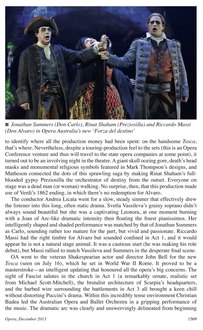 Copley însuși revenise pentru a revitaliza profilul acțiunii și personajele, pentru a înviora detaliile și pentru a da până și celor mai cunoscute detalii din propria producție o imagine nouă și îngrijită, special pentru centenarul operei. Un „condiment” suplimentar a fost reprezentat de mai multe nume care au debutat cu succes la Royal Opera. Printre ele, dirijorul de origine română stabilit în SUA, Christian Badea, a cărui direcție grafică, după un început puțin agitat și prea insistent, s-a așezat într-o linie plină de implicare vitală în drama de pe scenă, care a ținut ascultătorul într-o stare permanentă de alertă și atenție și a convins orchestra de la Covent Garden să cânte cu o sensibilitate egală față de sentimentul Puccinian din operă, dar și față de puterea și energia lucrării.