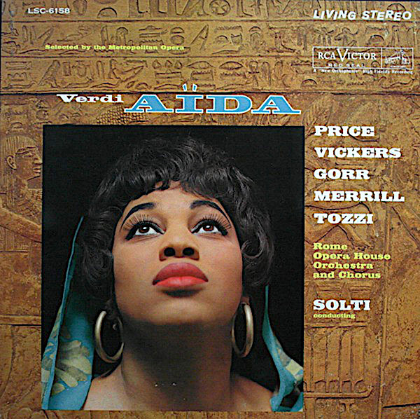 Audiția acestui disc e o experiență în sine. În primul rând, vocea lui Leontyne Price deconcertează, pentru că nu seamănă cu nimeni alta. Un timbru cărnos și particular, cu un registru mediu exotic, puțin răgușit, mereu senzual, care continuă cu acutele cele mai limpezi, perfecte pentru Aida. Apoi vine temperamentul, pe care soprana americană îl etalează cu brio, reușind concomitent să păstreze o linie nobilă a frazei. Incomparabil. Dar o Aida bună are nevoie cel puțin de o Amneris și de un Radamès de calibrul sopranei, plus un dirijor cu imaginație, ca să aibă succes. Rita Gorr are notele și autoritatea comparabile cu marile mezzo-soprane italiene ale epocii (Barbieri, Simionatto, sau Cossotto, care controlau rolul peste tot), dar și o personalitate unică și e reconfortant să asculți această Amneris cu adevărat regală, feminină și îndrăgostită, în dozajul corect. Jon Vickers înclină spre un Radamès mai mult eroic decât temperamental și, odată ce personajul își pierde rangul, eroismul face loc unui lirism emoționant în ultimul act. În rest, Robert Merrill e un Amonasro cam liniar, însă cu o voce foarte bună, ca de obicei. Bașii sunt neremarcabili, spre deosebire de Solti, care galvanizează orchestra romană, altădată atât de provincială încât e de nerecunoscut aici, o direcție riguroasă și vie, chiar dacă uneori lipsită de tandrețea unor Karajan, Muti sau Abbado, la comanda unor orchestre mai bune (Wiener Staatsoper, Royal Opera, Teatro alla Scala).
