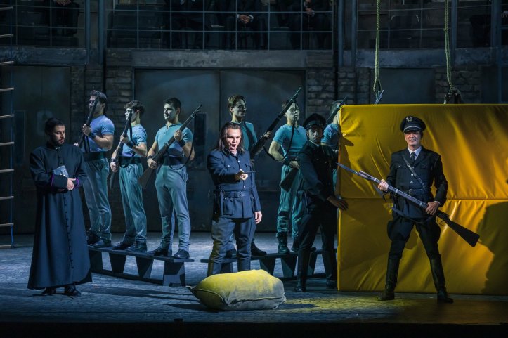 In montarea d-lui Șerban primează elementele de scenografia teatrala in disonanta cu întregul operei: corul imbracat in (veșnicele) costume mic burgheze cu joben !, soldații in uniforma nazi!, fătucile/ majorete cu baloane mimând ceva à la Molin Rouge 😃, ….