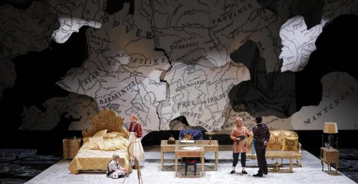 Povestea lui Boris, spusă de Kasper Holten, a început interesant, pe acordurile preludiului orchestral, cu Pimen contemplând contrariat cum paginile letopisețelor istorice sunt smulse de o mulțime ordonată de funcționari medievali. Scenografia lui Es Devlin e simplă și simbolică, dominată de o pânză de paraboloid în mijlocul scenei, fundalul fiind rezervat unor proiecții video uneori spectaculoase. Nu e ceva nou, de altfel Holten nu este neapărat un regizor foarte original la nivel vizual, inspirându-se uneori din alte puneri în scenă. În cazul acestei scenografii, din producția lui Stein Weige pentru San Francisco Opera din stagiunea 2008/2009, cu reminiscențe ale esteticii lui Andrei Tarkovski din celebra sa punere în scenă pentru Royal Opera House.