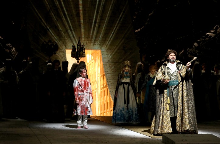 Scena încoronării a fost de departe cea mai impresionantă. Simplitatea scenică a funcționat foarte bine, cu puține efecte speciale de lumină, lăsând loc grandorii muzicii lui Musorgski. A fost electrizantă pur și simplu, emoția traversând fără probleme bariera ecranului TV. Chiar dacă, în context, corul a forțat uneori și a ratat puțin unisonul pentru a deveni o orgă umană, așa cum reușea pe vremuri Balșoiul. A fost momentul în care direcția muzicală a lui Riccardo Chailly a strălucit, găsind noi sonorități în partitura orchestrală. Aici e primul loc în care apar și fantasmele. O fantomă însângerată a țareviciului Dmitri îl bântuie pe Boris în această scenă, revenind obsedant de-a lungul operei, până la sfârșit. Suntem în plin Macbeth. Dar ce e prea mult strică. În partea a doua, această fantomă e însoțită de un întreg grup de copii cadaverici și însângerați, cărora li se adaugă și dublurile lui Fiodor și Xeniei, la fel de scăldați în sânge. E o imagine premonitorie, în realitate Fiodor va fi asasinat de falsul Dmitri, care apoi o va viola repetat pe Xenia. Dar aceste atrocități se vor petrece după ce acțiunea din opera lui Musorgski se va fi încheiat.