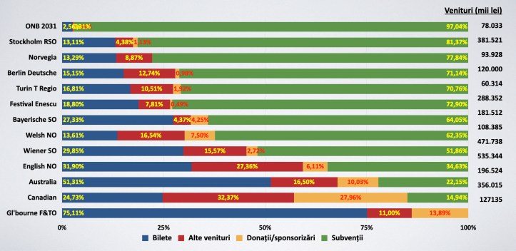 Nu ne putem compara cu Scala, nu ne putem compara cu Viena, din punct de vedere al proporțiilor veniturilor proprii. E foarte puțin. Asta nu înseamnă că nu există și în Europa teatre în care ponderea veniturilor proprii e mai mică. În Suedia e undeva în jur de 12%. Dar la Viena 40%. La Covent Garden peste 50%. Și aici, de ce spun că e o problemă de management? Pentru că în România, toți directorii de teatre, de filarmonici și de operă sunt artiști. Ei toată viața s-au pregătit în arta lor. Să recite poezii, să cânte la un instrument, să dirijeze, nu au niciun fel de studii în domeniul economic. Nu neapărat că ar trebui să aibă, dar nu s-au pregătit în mod special pentru asta niciodată. Drept urmare, e foarte greu să găsești pe cineva care să facă management artistic foarte bun și management financiar competent, și management comercial bun, și management administrativ în regulă.