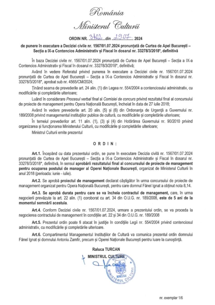 Abia pe 29 Iulie, dna Raluca Turcan semna un ordin de ministru prin care ministerul începea procesul de punere în practică a deciziei din justiție, trecând la pasul următor, negocierea contractului de management între Fănel Ignat și stat. Bineînțeles, într-o discreție absolută, ordinul nu e de găsit nici pe website-ul ministerului culturii și nici pe cel al Monitorului Oficial. Unul dintre articolele ordinului dădea posibilitatea contestării acestuia. Ceea ce dl Antoniu Zamfir, poziționat pe locul al doilea la deja faimosul concurs din 2018, a și făcut, iar Curtea de Apel din Craiova a și comunicat prompt primul termen, pentru 20 August.