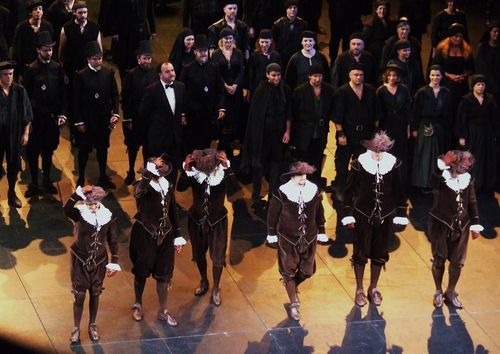 Desigur, toți soliștii au cântat excepțional, la un nivel greu de atins în vreun spectacol de la București. Nu pot să spun că am remarcat pe cineva în mod special, căci toți erau impresionanți, iar producția foarte frumoasă. Poplavskaya era o regină mai fragilă ca niciunde în altă parte, Keenlyside, un Rodrigo foarte bărbătos, dar într-un sens teatral, aș spune tipic englezesc. Emoția a venit de data asta din întregul ansamblu, impecabil. Așa că magia a fost atinsă, în ceea ce mă privește, de corul mesagerilor flamanzi, din scena Auto dafé-ului. O scenă alterată de regizor prin imprecațiile rostite de un inchizitor, care le cerea ereticilor să se pocăiască, strigându-i pe nume pe fiecare, Confessa la tua eresione!, replici care nu erau în libret, dar efectul dramatic era împins la paroxism. Corul flamanzilor era compus din doar șase oameni. După desfășurarea de efective de până atunci, acest grupuscul părea și mai vulnerabil. Când au început să cânte Sire, no, l’ora estrema ancora/ Non suonò per i Fiamminghi in duol, sunetul, inițial firav, treptat a ajuns să umple sala, urcându-și vocalizele până spre cele mai îndepărtate locuri, așezând greutatea unei rugăciuni profunde pe umerii tuturor martorilor ei. Părea o versiune redusă a corului sclavilor evrei din Nabucco, numai că mai plină de distincție, mai fină și de ce nu?, redusă la o scară umană, credibilă, posibilă. Șase voci numai, dar suficiente pentru ca durerea pe care o strigau să poată fi simțită ca asurzitoare în semnificații. Și spectatorii au simți asta, la final, la curtain calls, cei șase fiind foarte ovaționați. Cel puțin pentru mine, acesta a fost momentul șoc al serii, pentru că restul operei l-am văzut în transă, implicat în atmosferă până la sfârșit, într-o uimire mută, din care mă trezeam doar atunci când palmele mă dureau de atâta aplaudat.