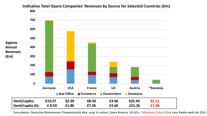 A few weeks ago, I published an abstract of the British consultant Antony Feeny’s PhD thesis on the economics of opera theatres. Starting from the data and graphs in that article, I wondered what the situation looks like in Romania? Romania is a country that spends relatively little money on opera, and the public subventions are predominant. We spend a quarter of Austria’s expenditure, even if our population is 2.22 bigger and the GDP has nearly the same value (around 450 billion USD).